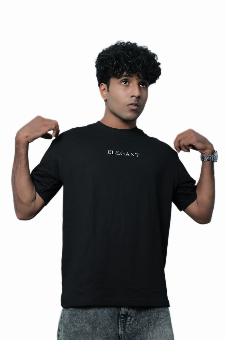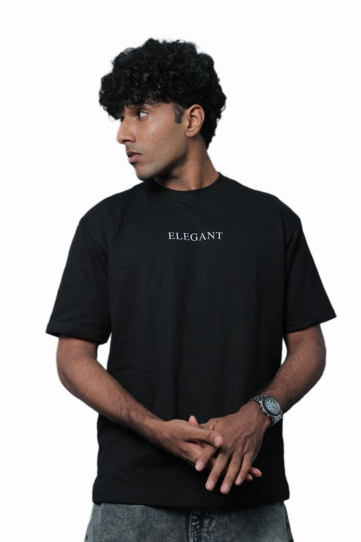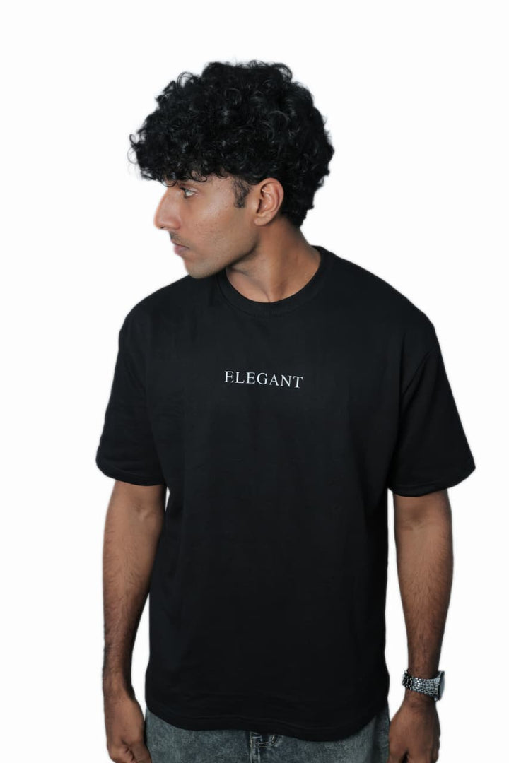 Key features include a classic crew neckline, reinforced stitching for durability, and a straight hemline that maintains structure. The minimalist design is highlighted by the subtle “ELEGANT” print at the center chest, adding a refined touch without overpowering the look.