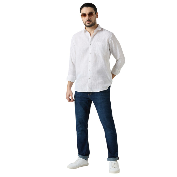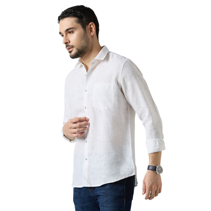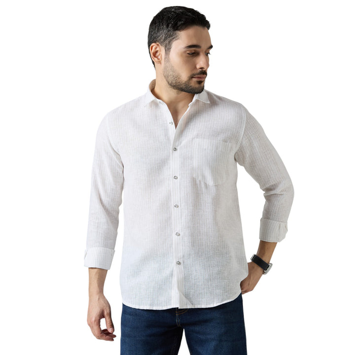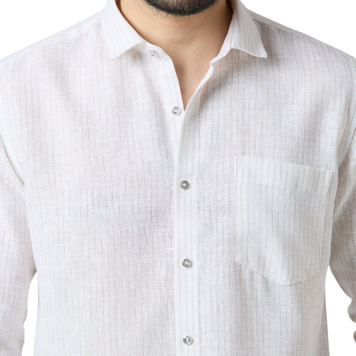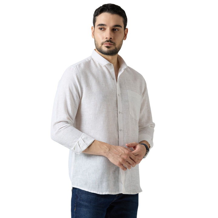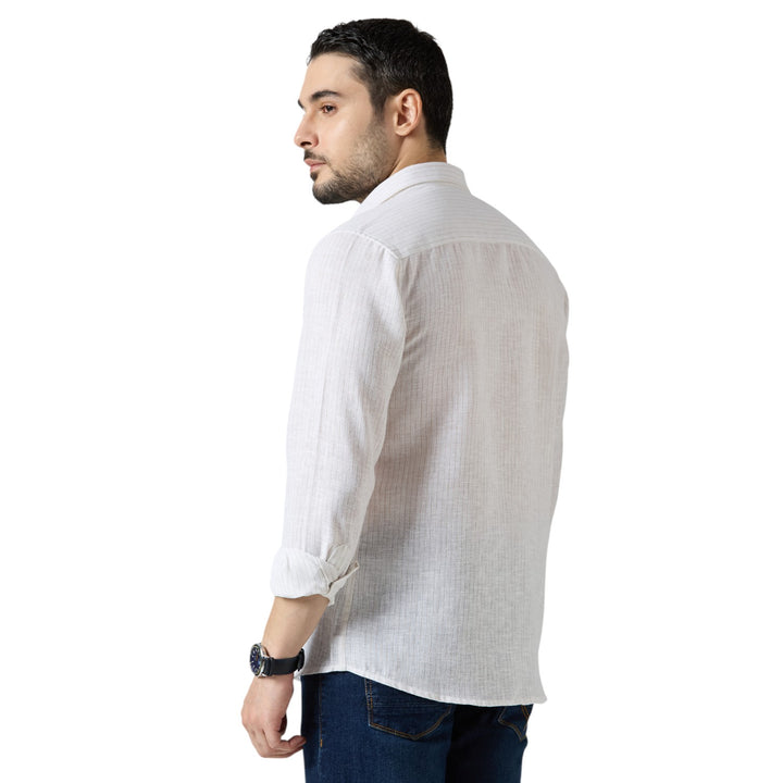 Crafted from a breathable, lightweight linen-blend fabric, this off-white shirt features a unique, subtle vertical pinstripe weave that adds depth and sophistication. This material ensures maximum airflow, keeping you cool and looking sharp whether you're at a beachside dinner or in a relaxed business meeting.