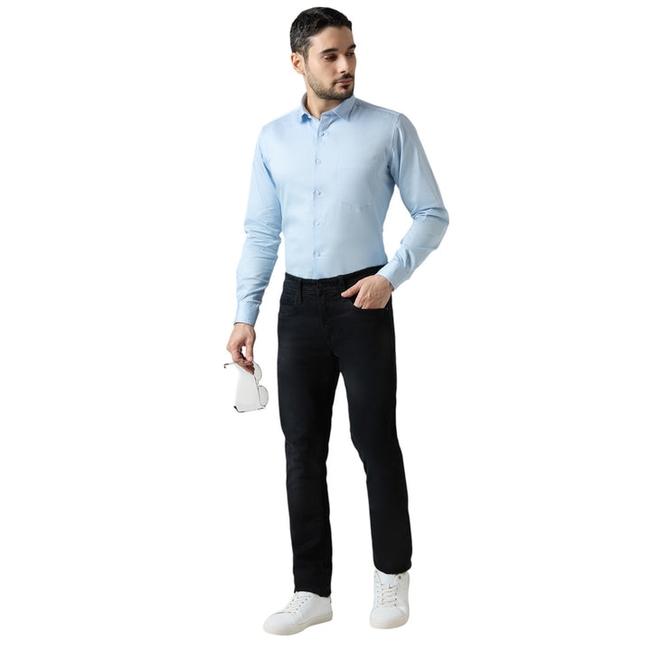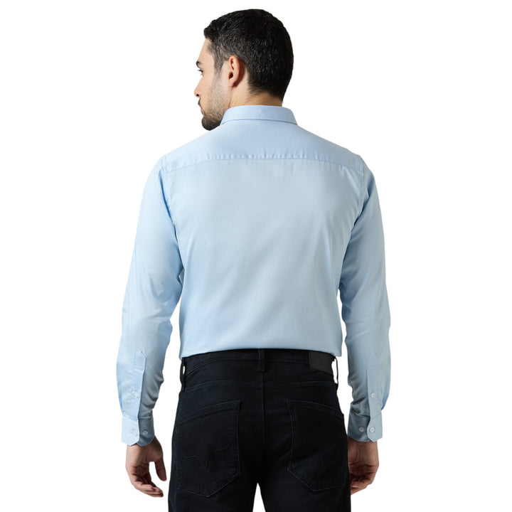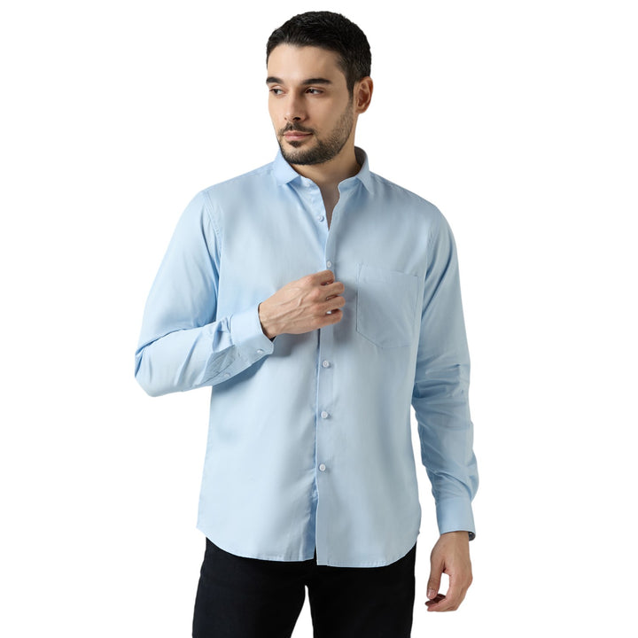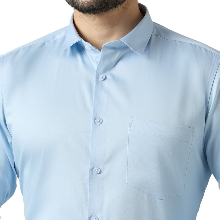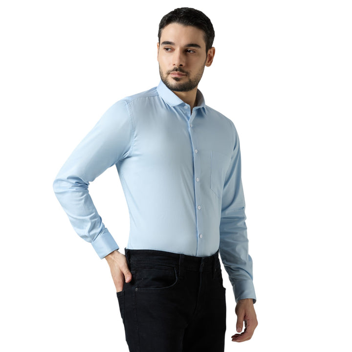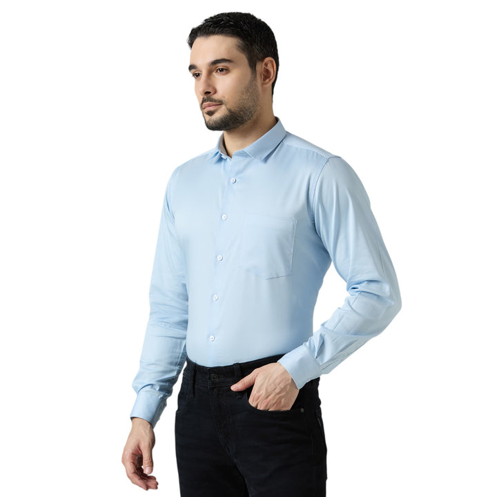 Designed in a slim fit cut, with full sleeves, a classic collar, and a smart chest pocket, this shirt combines modern elegance with everyday practicality. Its soft sky blue tone makes it perfect for office wear, business meetings, parties, and formal occasions.